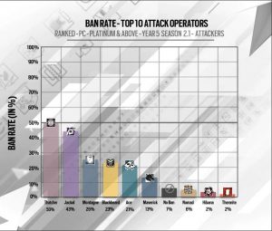 Currently, he is sitting on a 4th spot and we have an interesting situation – 3 operators share 2nd to 4th spot with 32-33% bans – Montagne, Blackbeard, and Jackal.ZERO is not on the top 10 ban chart